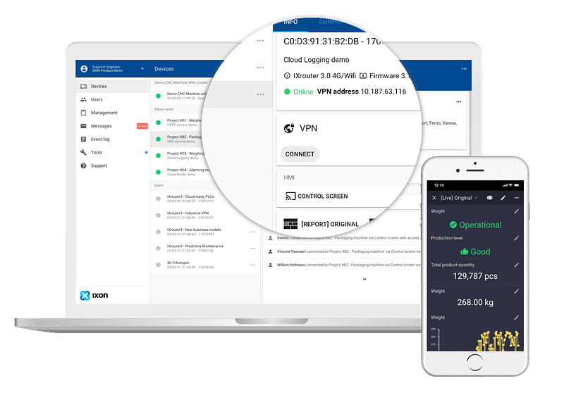 IXON se fundó en 2014 con el objetivo de facilitar la conexión a la nube, haciéndola más segura y más accesible para los usuarios. Con sede en los Países Bajos, IXON es ahora una de las plataformas IIoT de servicio remoto más valiosas y fáciles de usar para los fabricantes de máquinas e integradores de sistemas.